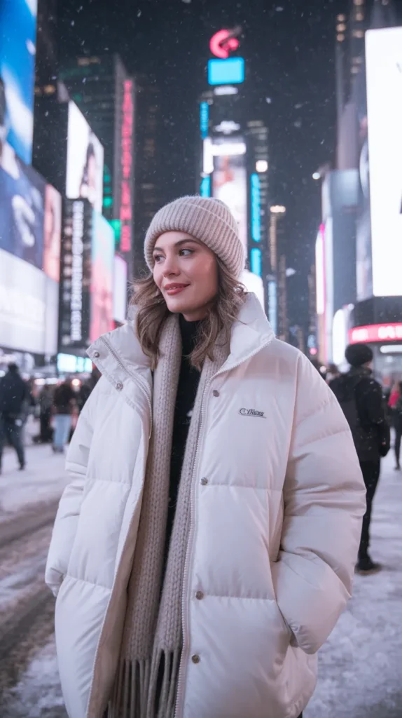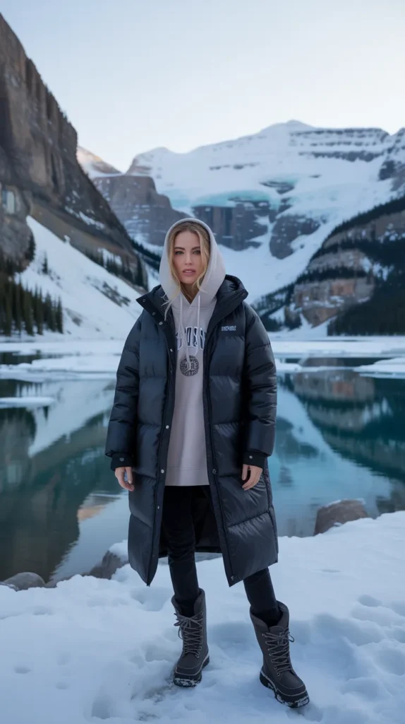 When it’s freezing and fashion feels optional, go for an oversized hoodie, longline puffer, and snow boots. It’s the coziest winter outfit ever warm, practical, and still stylish enough for that “cute but comfy” vibe.