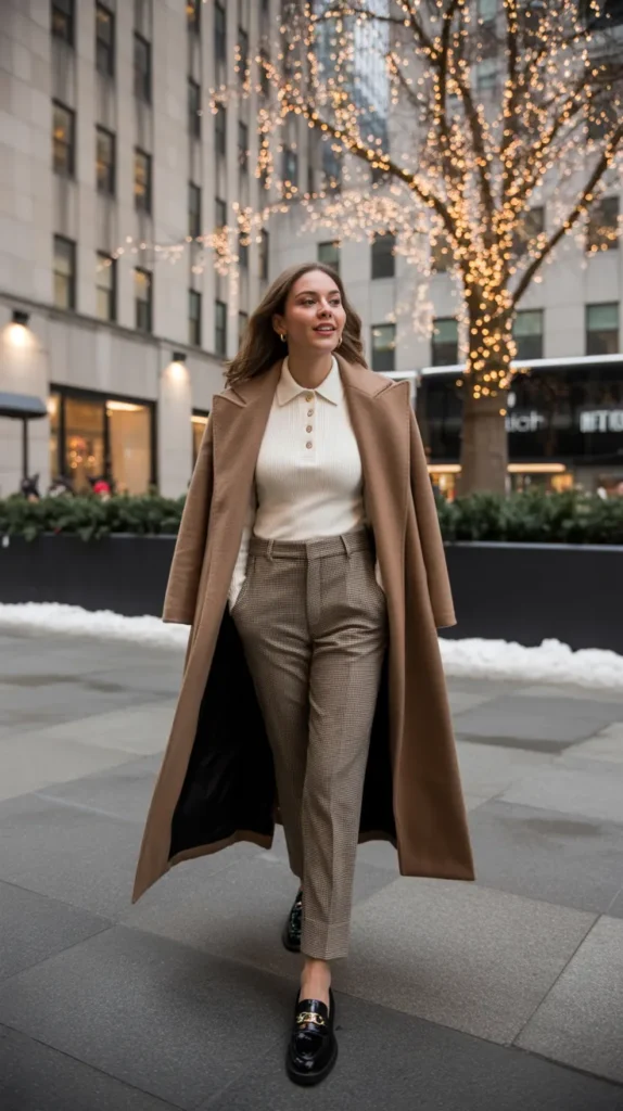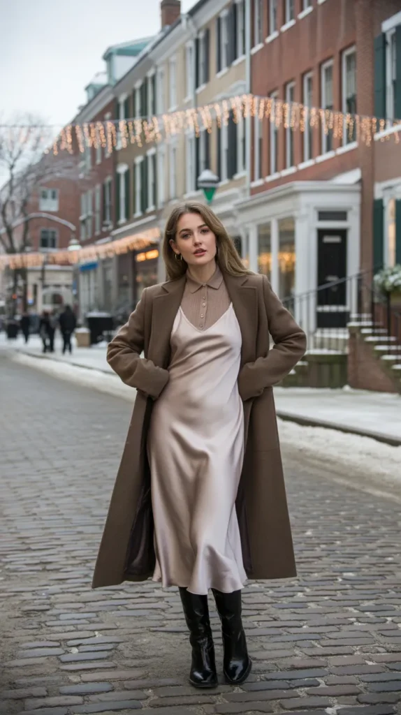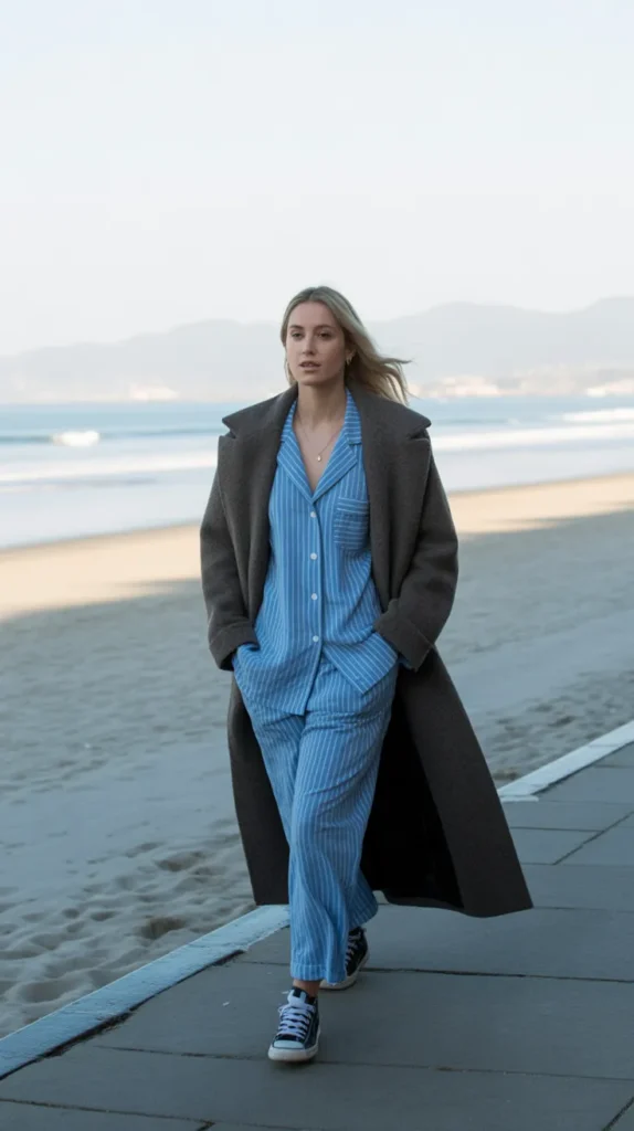 Yes, pajamas but make it fashion. An elevated pajama set layered with a long wool coat gives chic off-duty energy. It’s the cozy outfit you can actually wear outside without feeling underdressed. Add sleek boots or sneakers, and you’ll look effortlessly trendy while staying comfy.