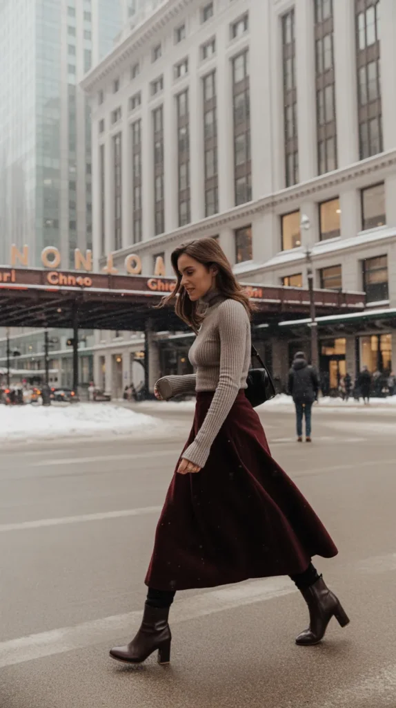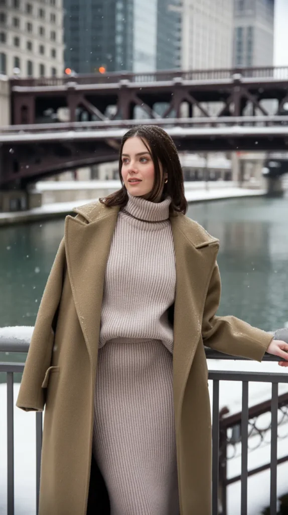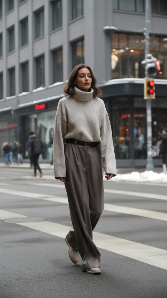 A wool turtleneck tucked into wide-leg pants with a belt gives off minimalist magic. It’s structured but soft the kind of winter fit that’s warm enough for cold offices but still chic for dinner afterward. A pair of statement earrings can instantly dress it up without losing that clean, refined feel.