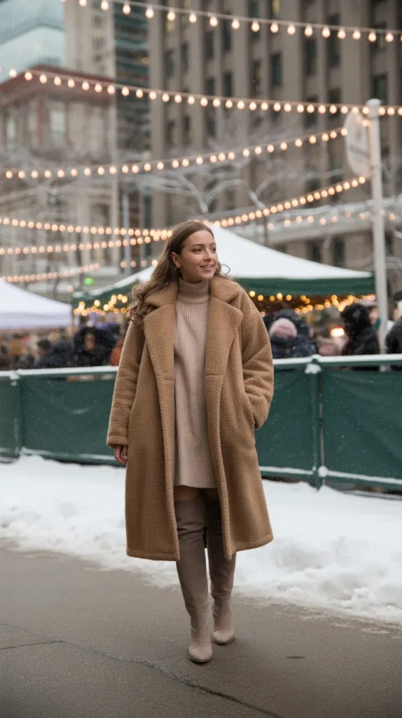 The teddy coat is practically a winter icon. Worn over a knit dress and knee boots, it gives full-on cozy glamour. This cold weather outfit feels like wearing a hug while looking totally chic perfect for date nights or holiday shopping sprees.