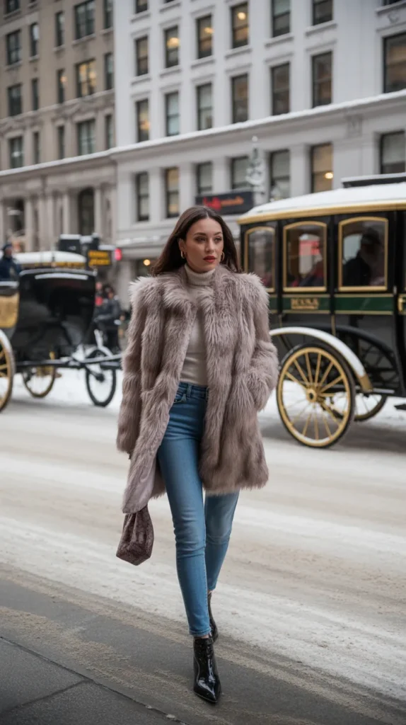 A faux fur coat paired with skinny jeans and a turtleneck brings instant drama to your day. It’s warm, plush, and adds that little extra “main character” energy to your winter fits. Great for dinners, events, or when you just want to look amazing doing errands.
