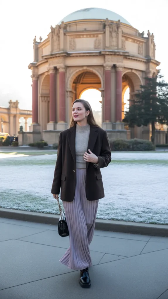 A wool blazer layered over a knit top and maxi skirt delivers refined coziness. It’s perfect for days when you want something polished but still warm. This cold weather outfit transitions beautifully from workday sophistication to evening ease.