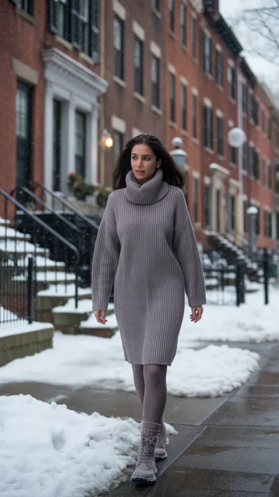 2. Long Sweater Dress with Thick Tights and Boots