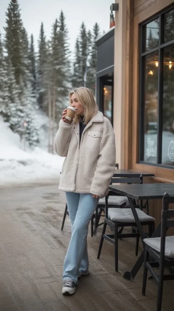 A faux sherpa jacket and straight jeans are basically made for chilly weekend errands. The plush texture brings all the cozy feels, while the jeans keep things simple and easy to move in. Add sneakers or ankle boots, and you’ve got the ultimate relaxed cozy outfit that still looks put-together.
