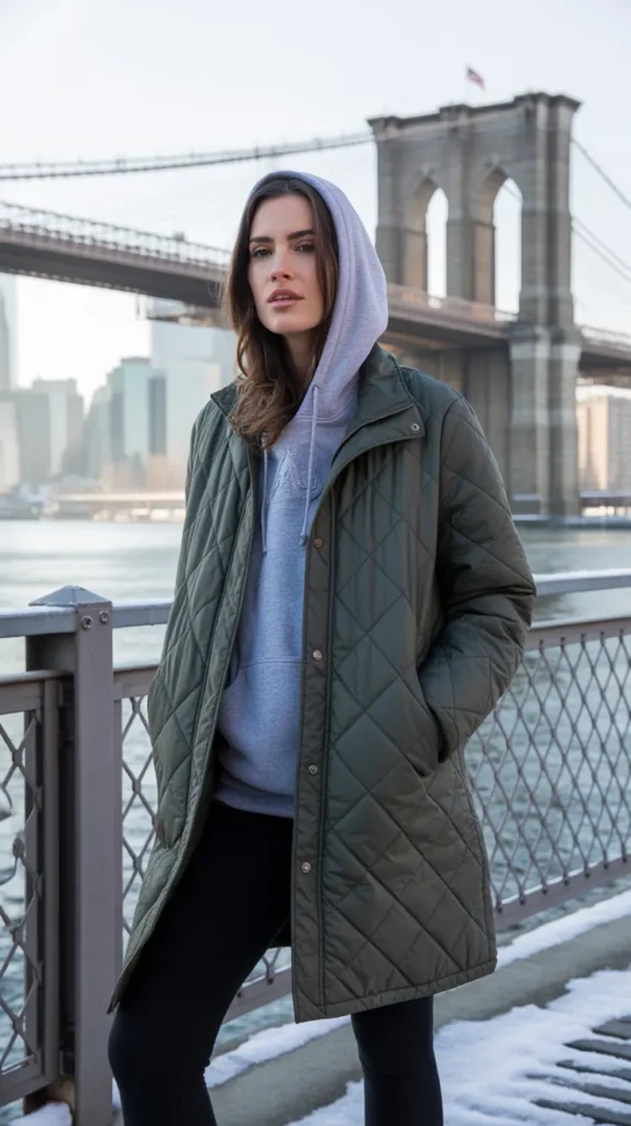 When the air bites back, reach for a quilted parka, hoodie, and leggings. This is the classic cold weather outfit that’s practical yet totally street-style ready. Add chunky sneakers and a wool beanie to take your cozy layers from “errand run” to “effortlessly cool.”