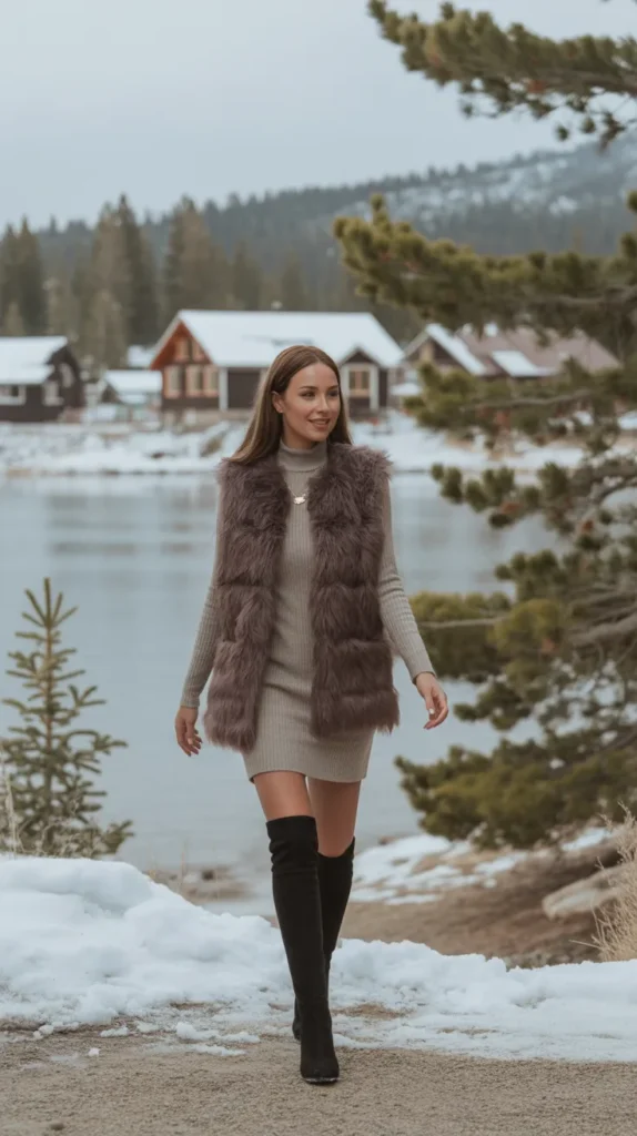 Want to feel elegant and warm at the same time? Layer a faux fur vest over a sweater dress. It’s cozy, feminine, and adds instant texture to your winter fits. Perfect for lunch outings or date nights when you want that luxe touch without too much layering.