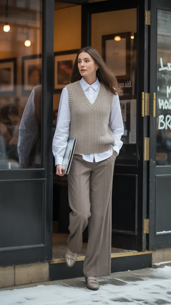 A knitted vest over a blouse paired with trousers gives easy, effortless sophistication. It’s business casual with a cozy twist exactly what your cold weather outfits need for the office or coffee catch-ups. Add loafers or ankle boots and you’re set for all-day style.