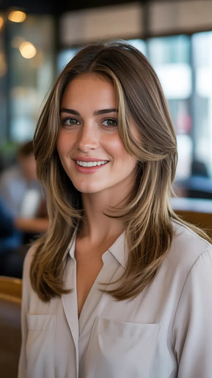 The image showcases beautiful, flowing waves that frame the face nicely. The subtle highlights enhance the layers, giving depth and dimension. This hairstyle is versatile; you can wear it casually or dress it up for a night out.