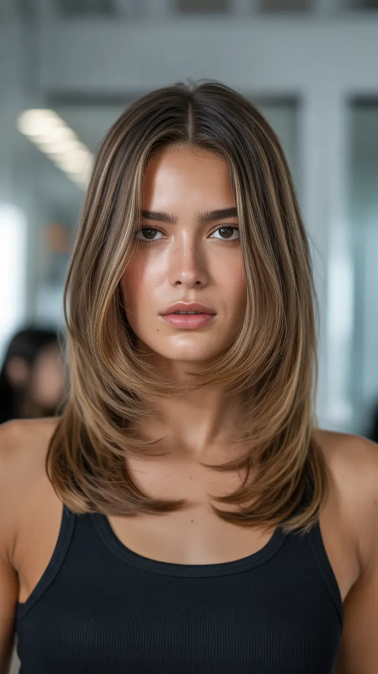 The image showcases a stunning example of this hairstyle. The straight layers fall gracefully, framing the face beautifully. The highlights add depth and dimension, catching the light in a way that enhances the overall look.