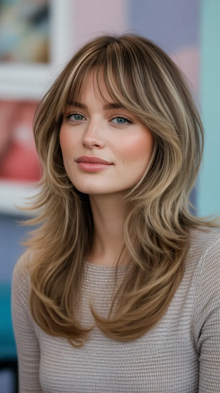 Feathered layers with bangs are a classic look that brings back the iconic volume of the ’90s long layered hair. This style features soft, wispy layers that create movement and texture, making it perfect for anyone looking to add some flair to their hair.