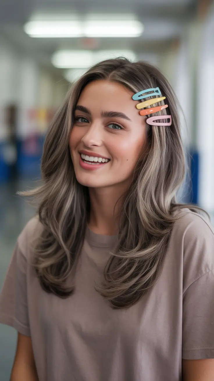 The long layers create movement and texture, making the hair look effortlessly chic. The addition of colorful accessories not only enhances the hairstyle but also reflects the bold fashion choices of the ’90s. These clips can easily transform a simple hairstyle into a statement piece, showcasing individuality and flair.