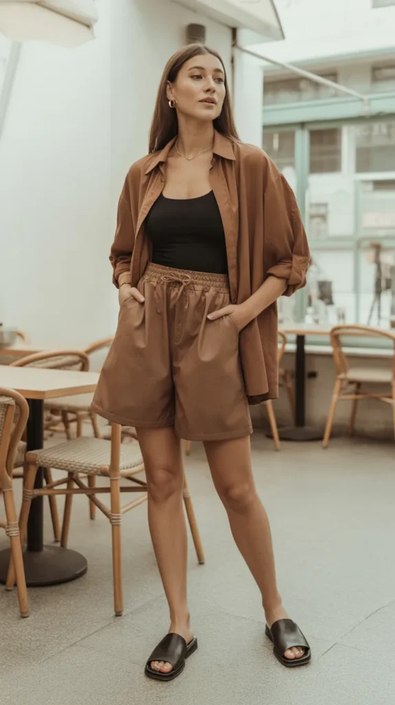 Earthy brown tones paired with a fitted black bodysuit give this outfit a naturally polished, flattering shape. You get the comfort of baggy shorts but the clean lines of a fitted top. Add an oversized unbuttoned shirt for an extra layer and slip-on mules to keep things effortless yet elevated. A great balance of chic and easygoing.