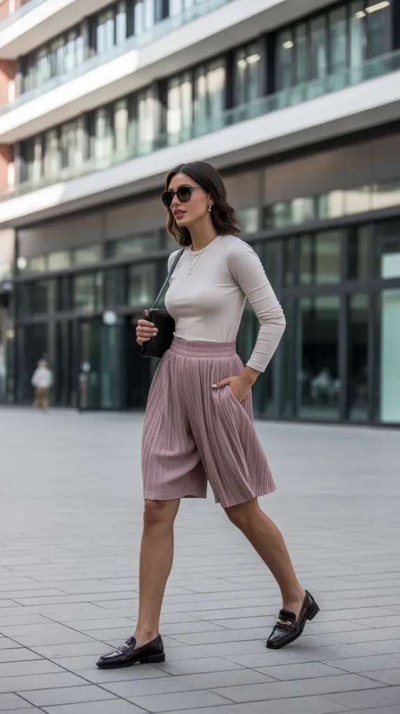 This look leans slightly more polished thanks to the pleated shorts and clean lines. The fitted long-sleeve top balances the roomier bottom, and loafers give the whole outfit a classy twist. A structured mini bag adds sophistication, making this a great everyday look when you want something stylish but still incredibly comfortable.