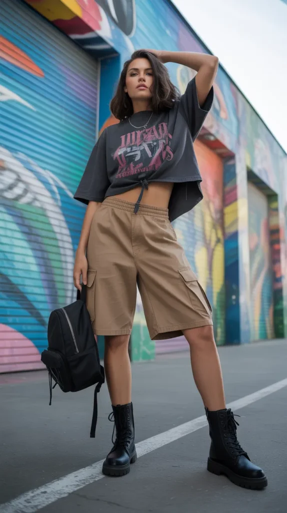 If you love that edgy, streetwear-inspired aesthetic, this one is your go-to. Baggy cargo shorts instantly give the outfit structure and movement, and the cropped graphic tee adds personality and a flattering bit of shape. Combat boots bring attitude, and a mini backpack adds practicality while keeping the vibe playful.