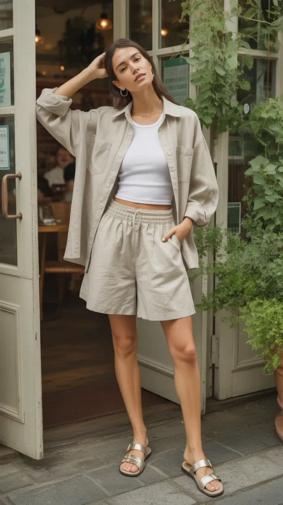 Airy, breathable, and perfect for warmer days, linen baggy shorts instantly feel elevated. Wear a ribbed tank underneath and leave your button-up shirt open for that breezy, effortless look. Flat sandals maintain the relaxed mood, while the open layers create natural movement as you walk. Great for beach towns, shopping days, or casual lunches outside.