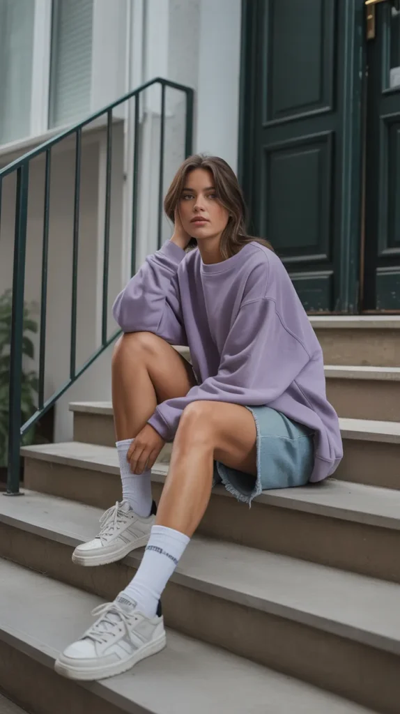 Soft, oversized, and cozy this combo nails that “effortless cool girl” aesthetic. The distressed shorts bring a bit of edge, the oversized sweatshirt adds warmth, and crew socks with dad sneakers finish it off with a nod to 90s street style. Ideal for transitional weather or relaxed weekend plans.