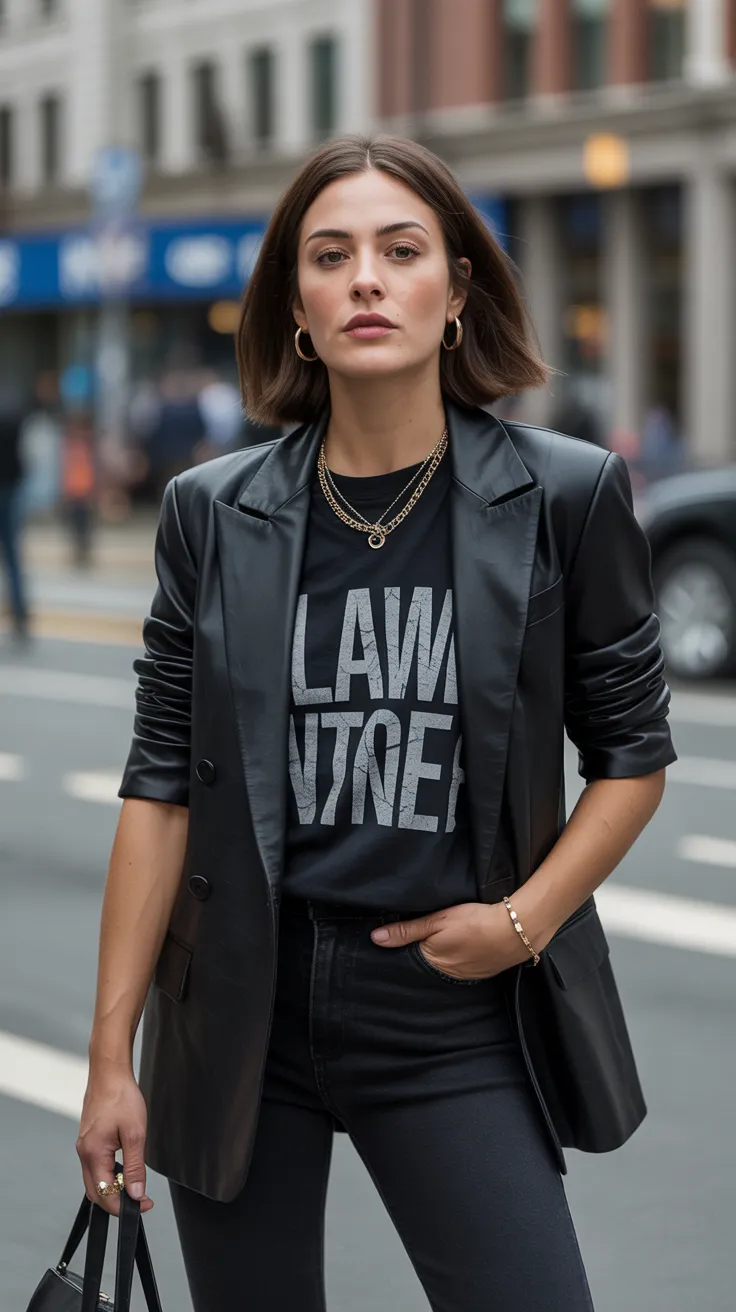 An all black outfit is a timeless choice that never goes out of style. Pairing a graphic tee with a leather blazer creates a chic yet relaxed vibe, perfect for casual outings or a night out with friends. This look is a great way to showcase your personality while keeping it simple and classy with black jeans.