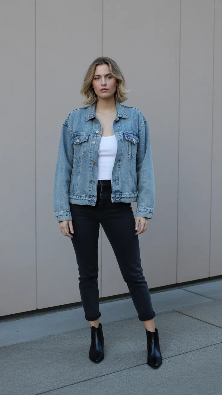 A classic look that never fails is pairing black jeans with a denim jacket and ankle boots. This simple chic outfit is perfect for casual outings or even a relaxed day at work. Throw in a classy baggy jeans style for a laid-back vibe, and you’re ready to go!