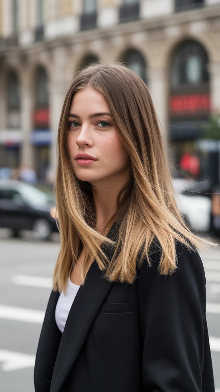 This look features a stunning straight long cut with beautiful blonde balayage on brown hair. The blend of colors creates a soft, sun-kissed effect that adds depth and dimension. The straight style enhances the sleekness of the hair, making it look shiny and healthy.