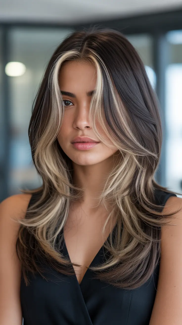 Blonde highlights on dark hair can create a stunning contrast that really stands out. This look is perfect for anyone wanting to add some glow and dimension to their style. The side-swept layers in this image enhance the overall effect, making the highlights pop even more.