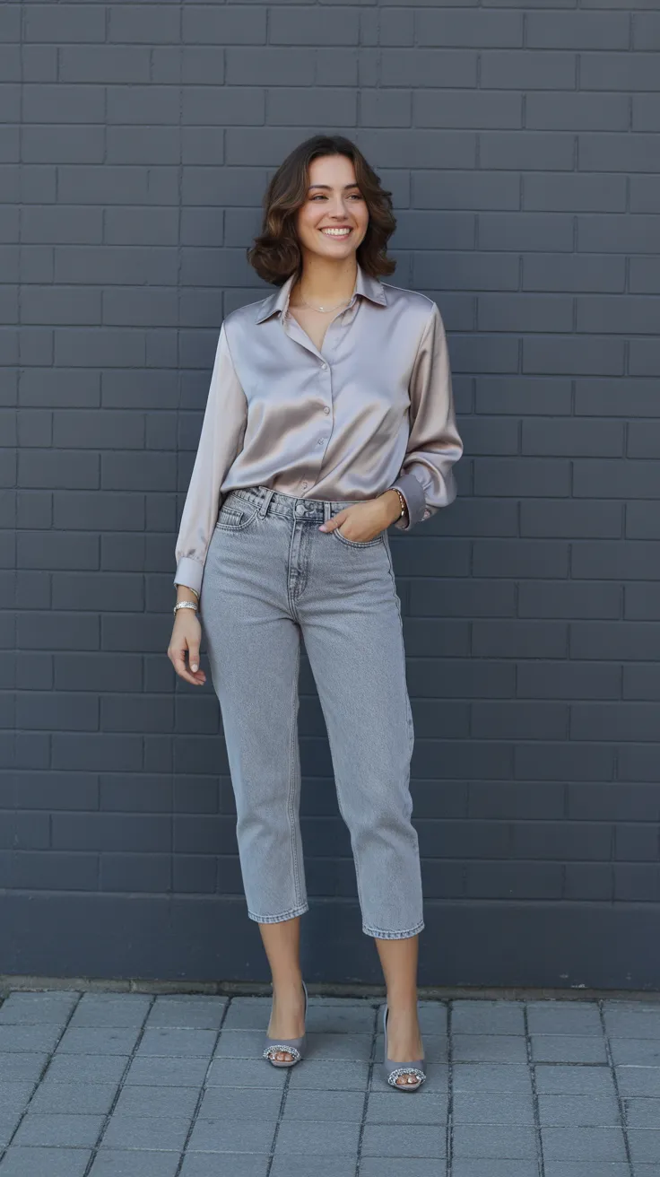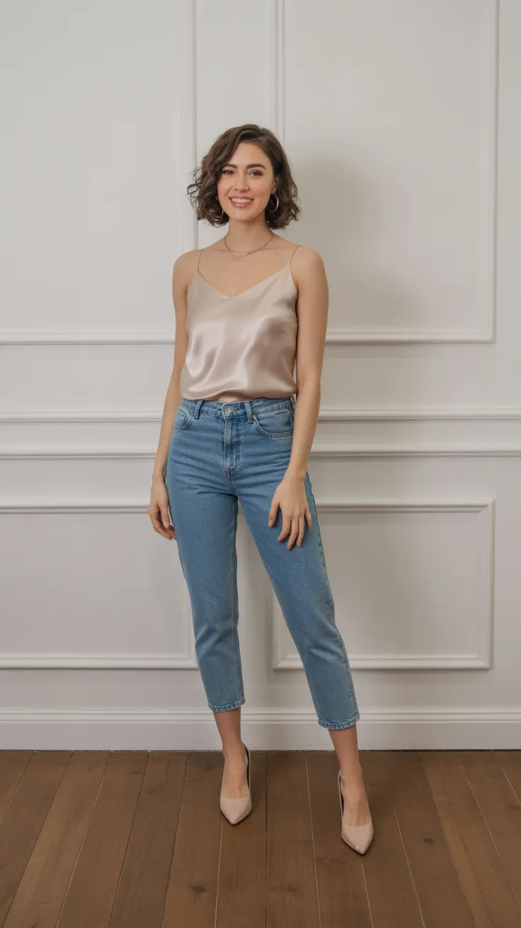 Blue cropped jeans paired with a satin cami create a chic yet casual vibe perfect for any day. This look is great for casual day outfits or even girly outfits that stand out. Whether you’re heading to class or meeting friends, this combo is a go-to for stylish uni outfits.