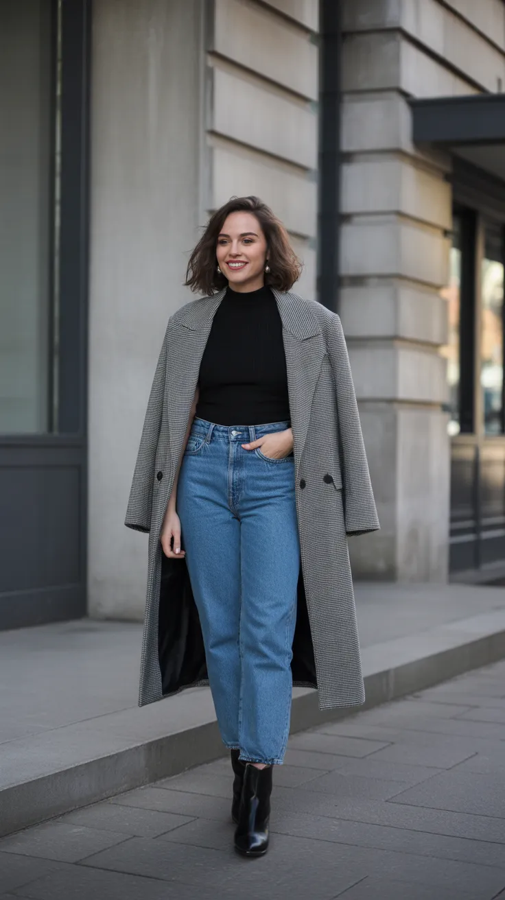 Pairing blue jeans with a structured coat and ankle boots creates a chic look perfect for any casual day. This outfit is versatile enough for a casual college outfit or a stylish street style ensemble. It’s a great way to stay comfortable while looking effortlessly put together!