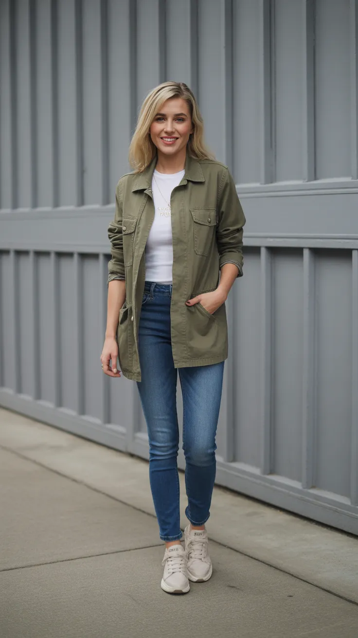 Blue skinny jeans paired with a utility jacket create a stylish and relaxed look for any casual day. This outfit is perfect for uni outfits or casual college outfits, making it easy to transition from class to coffee with friends. Add some ankle boots for a chic finish that looks great on the streets.