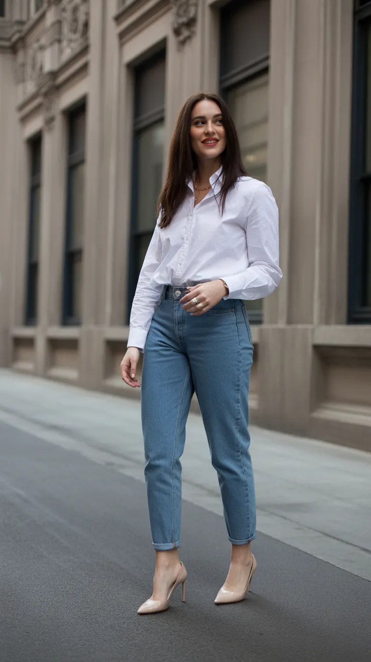 Pairing blue jeans with a crisp white button-up creates a fresh and chic look. This outfit is perfect for casual day outings or even casual college outfits. Add nude heels to elevate the style and make it a go-to for looks street style.
