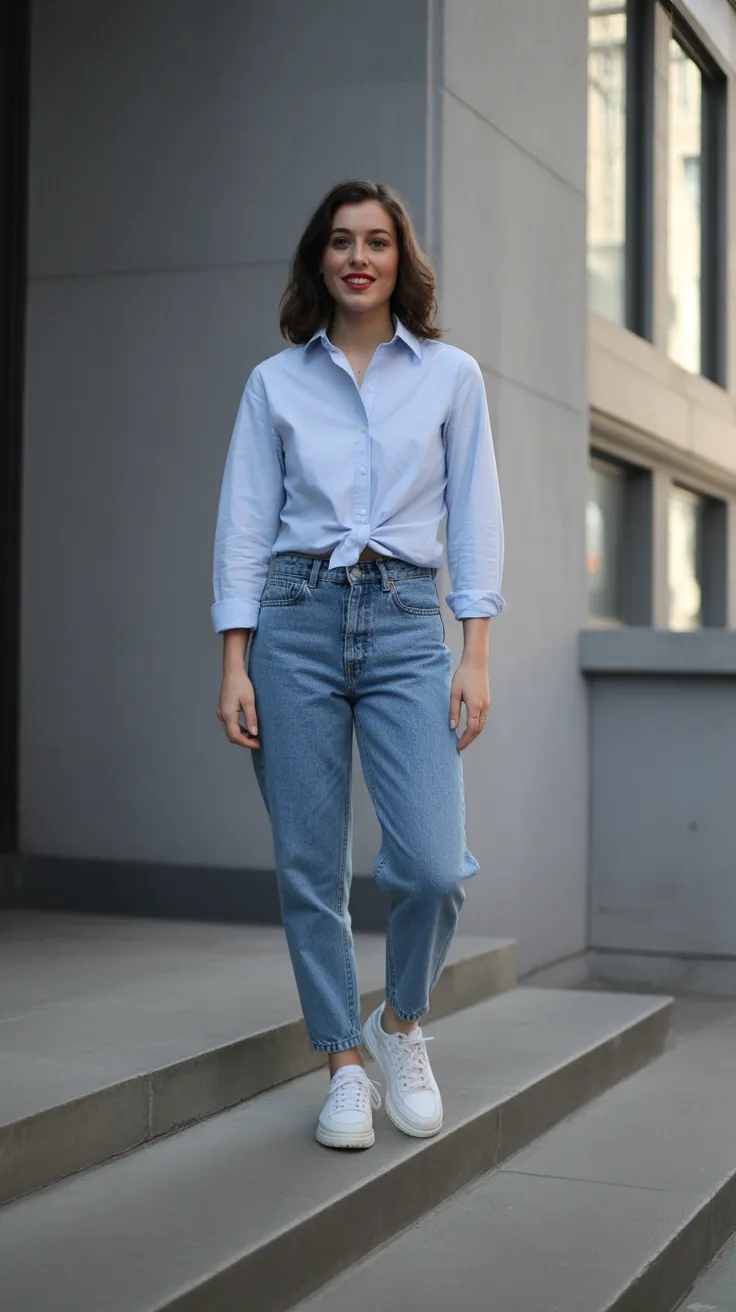 Blue mom jeans paired with a button-up shirt create a stylish yet relaxed look. This outfit is perfect for casual college outfits or a day out with friends. It’s a simple way to keep your style chic while staying comfortable.