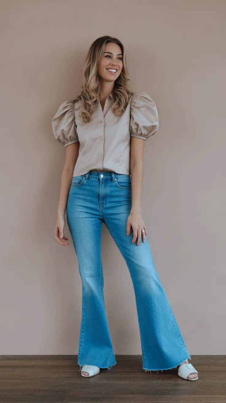 6. Blue Flare Jeans With Puff-Sleeve Blouse