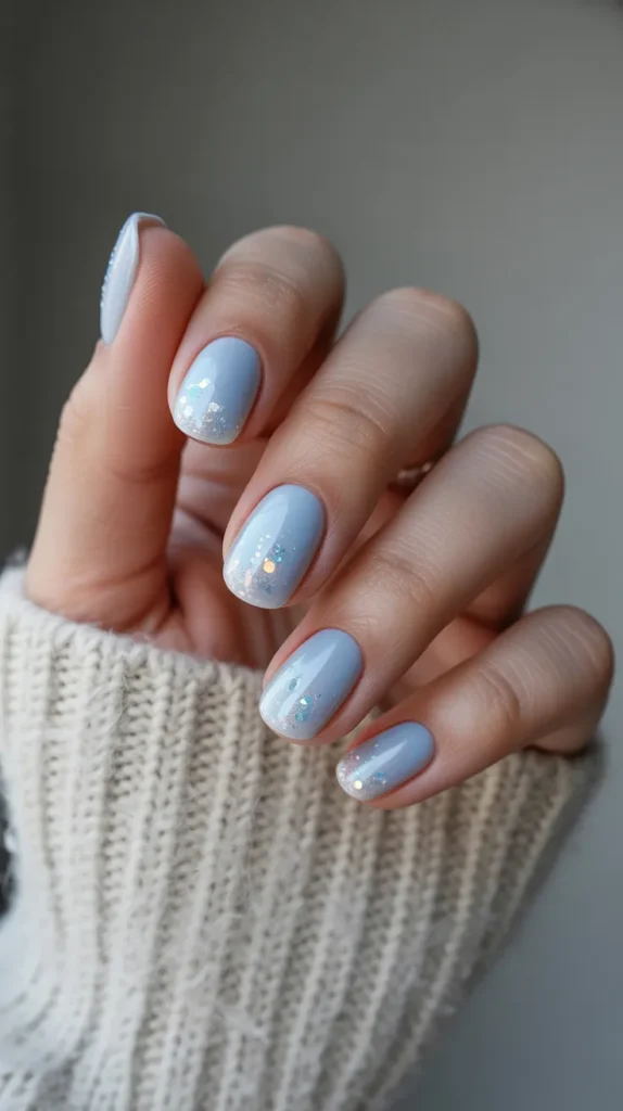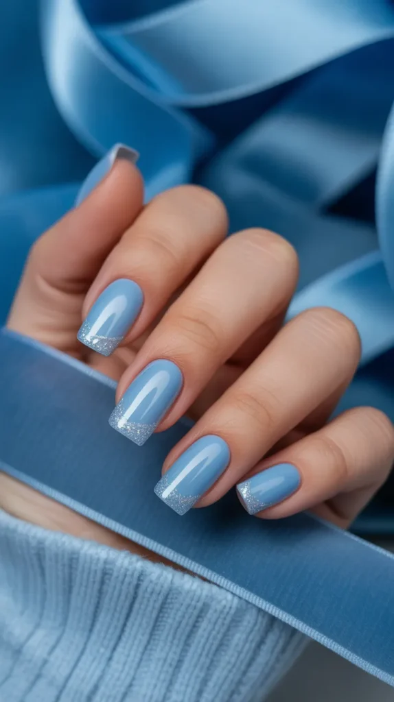 Frosted blue glitter French fades combine softness with shine. The gradual transition from baby blue to glitter feels delicate yet festive. It’s like your nails are dusted with snow subtle, sparkly perfection. ❄️