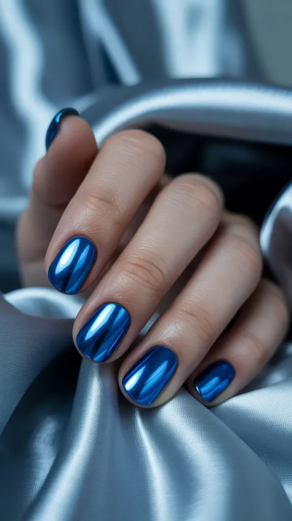 Blue chrome mirror nails are glossy, bold, and totally futuristic. The metallic shine reflects light in the coolest way, making your nails look like liquid metal. It’s perfect for nights out or anyone who loves high-shine drama. 💙