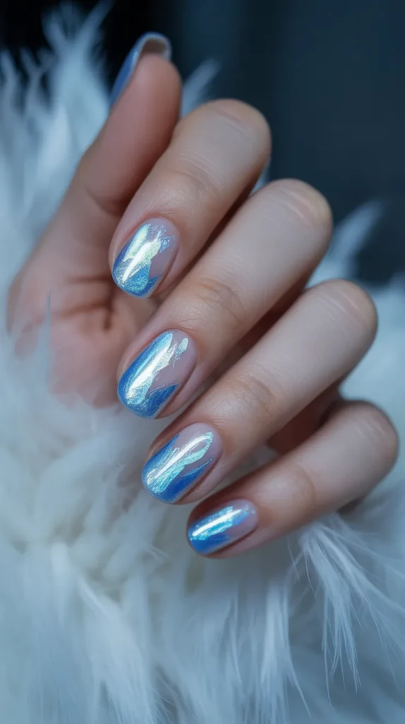 Iridescent ice nails shimmer with holographic foil for that frozen, glassy look. They’re ethereal, eye-catching, and perfect for anyone who wants a soft statement. Think snow queen energy subtle but stunning. 🧊