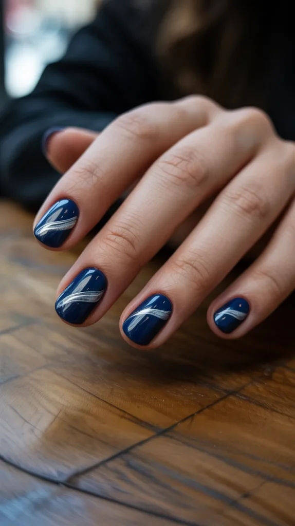 Metallic glitter accents instantly level up navy blue nails. A single silver glitter nail adds that “just enough” contrast to keep things interesting. It’s bold yet balanced the perfect mix of classy and fun. 💅