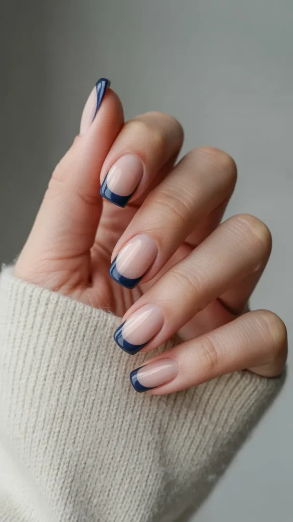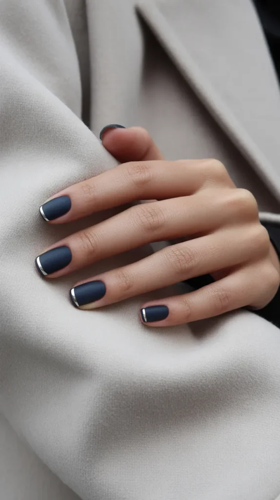 Silver-tipped navy nails are sleek, modern, and impossibly elegant. The thin chrome line against the matte base gives a minimalist edge that feels very “fashion week in winter.” If you love subtle details, this one’s for you. ✨