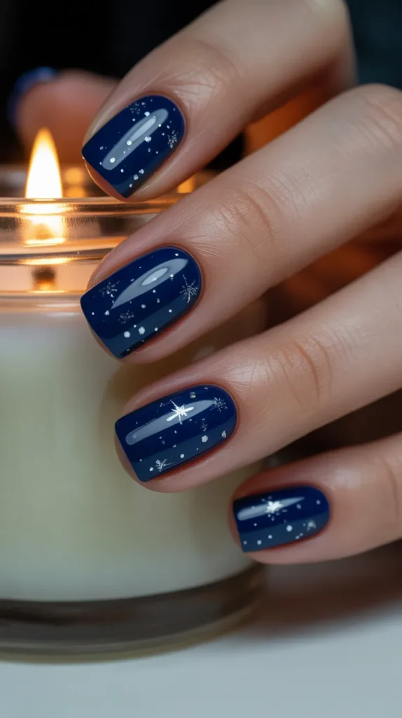 Sparkling midnight sky nails are as dreamy as they sound. Tiny silver flecks against a deep navy background look like stars scattered across the night. They’re elegant, mysterious, and endlessly wearable. 🌌