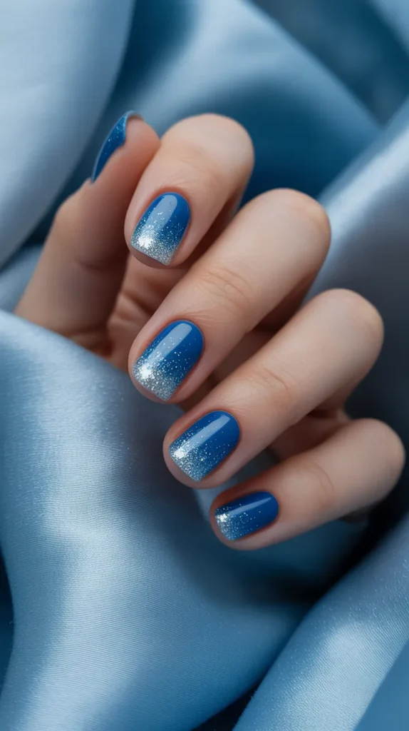Silver glitter ombré tips look like freshly fallen snow melting into blue skies. The gradient feels soft and elegant while still catching the light beautifully. It’s simple, chic, and one of those winter nails blue designs that never fails. 💙