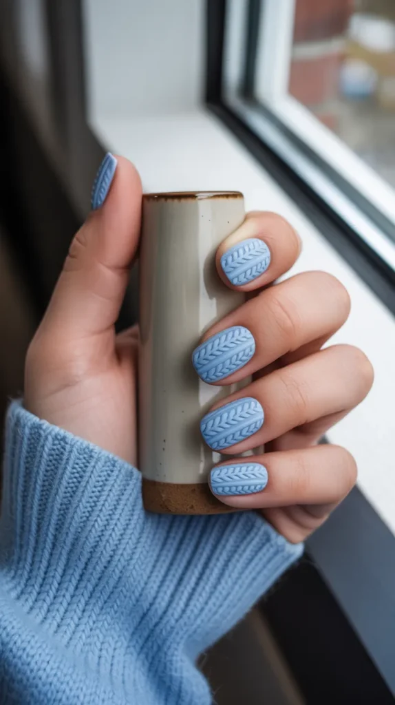 Sky blue sweater nails are cozy perfection. The raised knit texture adds playful detail while the matte finish keeps it chic. These nails feel like your favorite winter sweater in manicure form cute, comfy, and camera-ready. 🧶