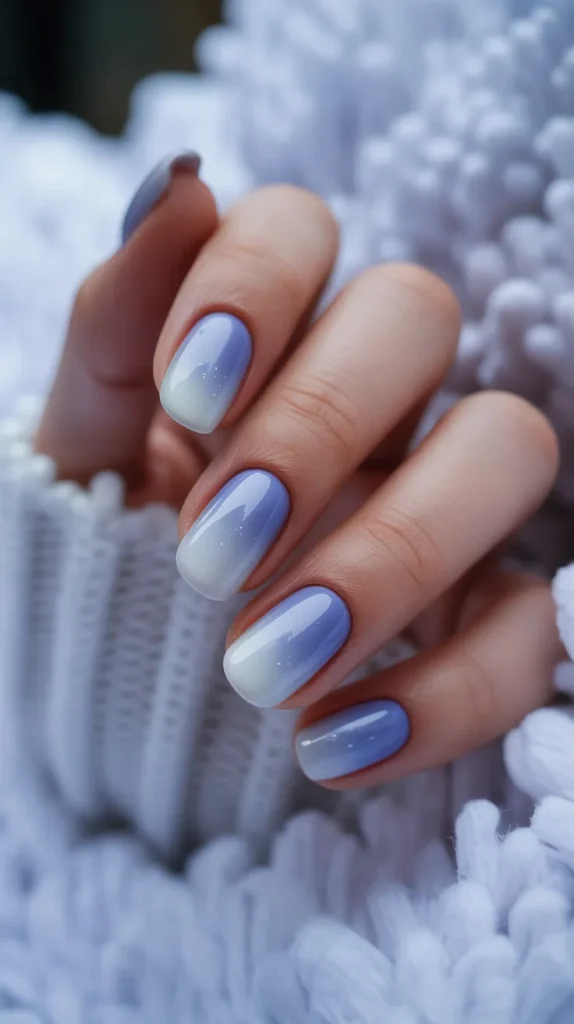 Frozen periwinkle ombré nails are straight out of an ice castle fantasy. The soft blend from cool blue to pearly white makes them shimmer like snow under moonlight. It’s magical, feminine, and totally winter-approved. ❄️