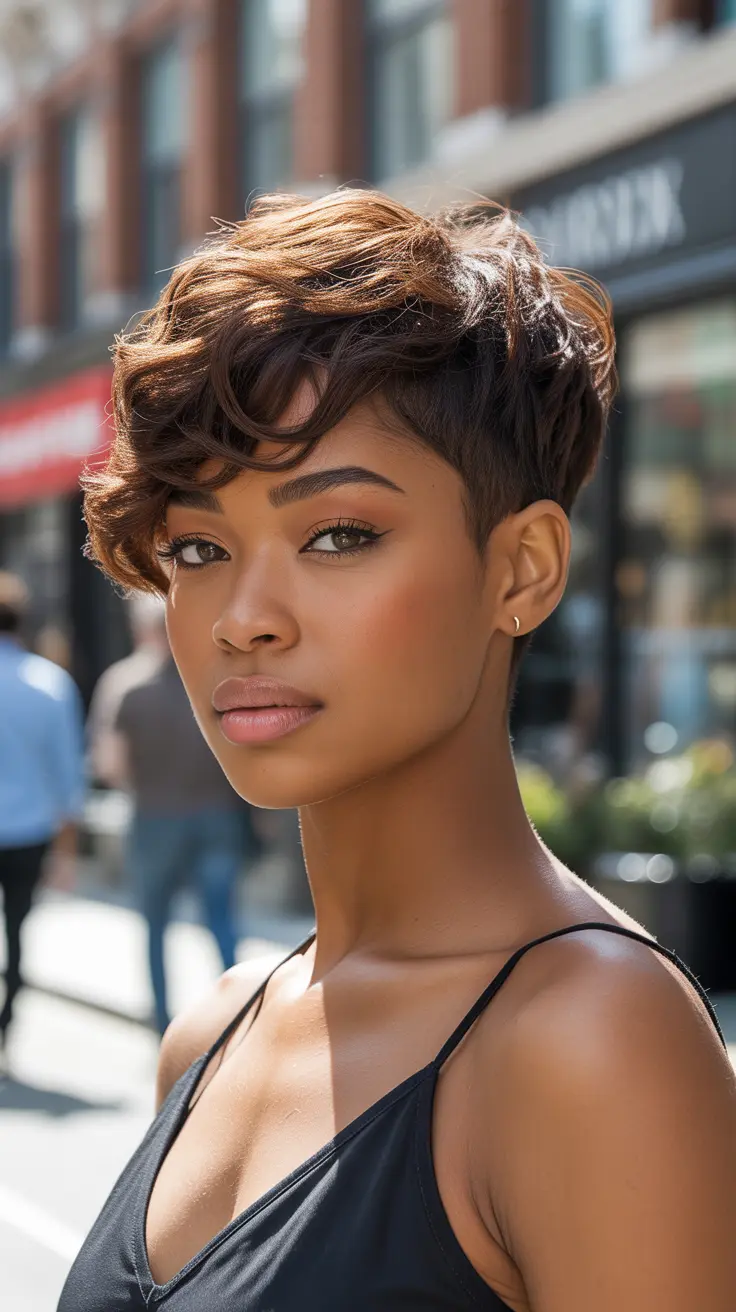 The short brown pixie cut is a stunning choice for Black women looking to showcase their natural beauty. This style features defined edges that create a sharp and polished look. The rich brown color adds warmth and depth, making it a versatile option for various skin tones.