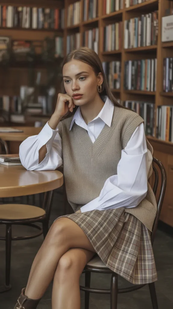 Layering perfection this look adds depth and personality to your outfit. A fitted shirt under a vest creates structure, while rolled cuffs and light accessories keep it playful. It’s ideal for transitional weather and adds instant preppy charm.