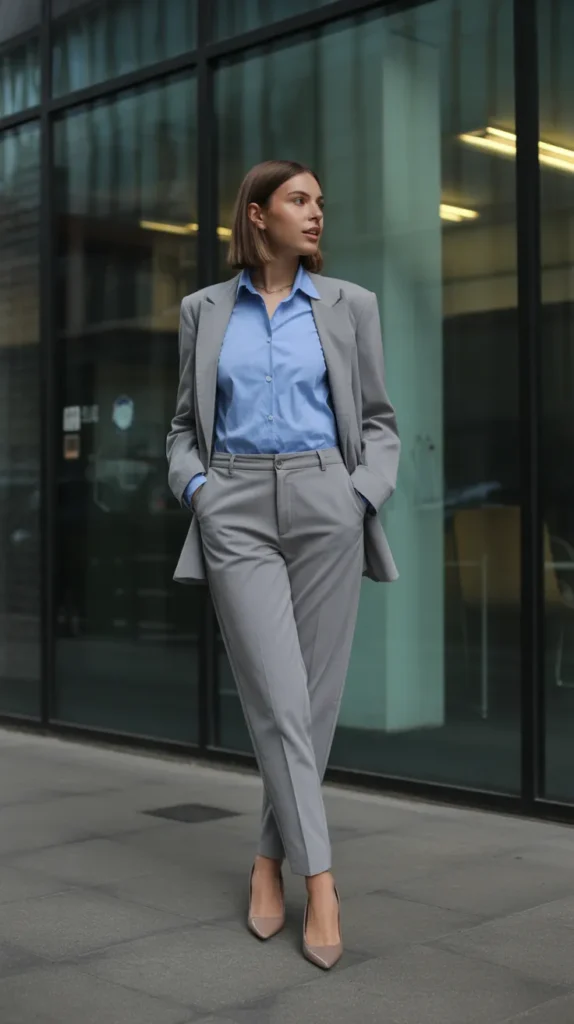 Timeless and sharp, this look proves that classics never fade. The blue button-up brings a pop of color under a neutral blazer, keeping it professional yet stylish. Pair with slim trousers or jeans and a bold lip for instant sophistication.