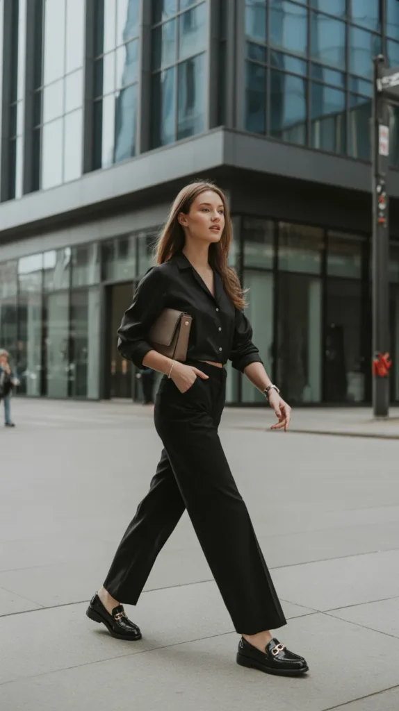 A sleek, monochrome pairing that’s as powerful as it is chic. The flowing wide-leg trousers create movement, while the structured shirt grounds the look. Add loafers or heels and gold jewelry for the perfect blend of sophistication and strength.