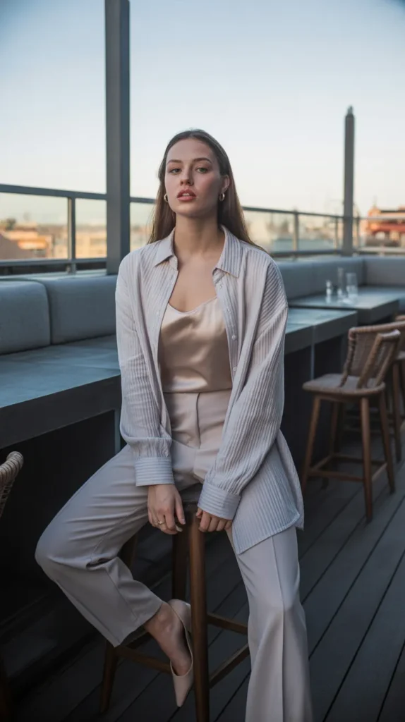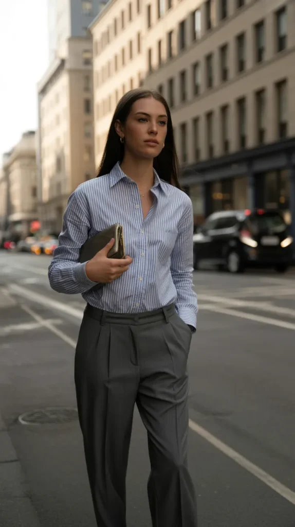 A crisp striped shirt paired with tailored trousers creates a flawless balance of smart and relaxed. Add heeled loafers or pumps for the office, then switch to mules for dinner. It’s a polished yet approachable look that transitions seamlessly through your day.