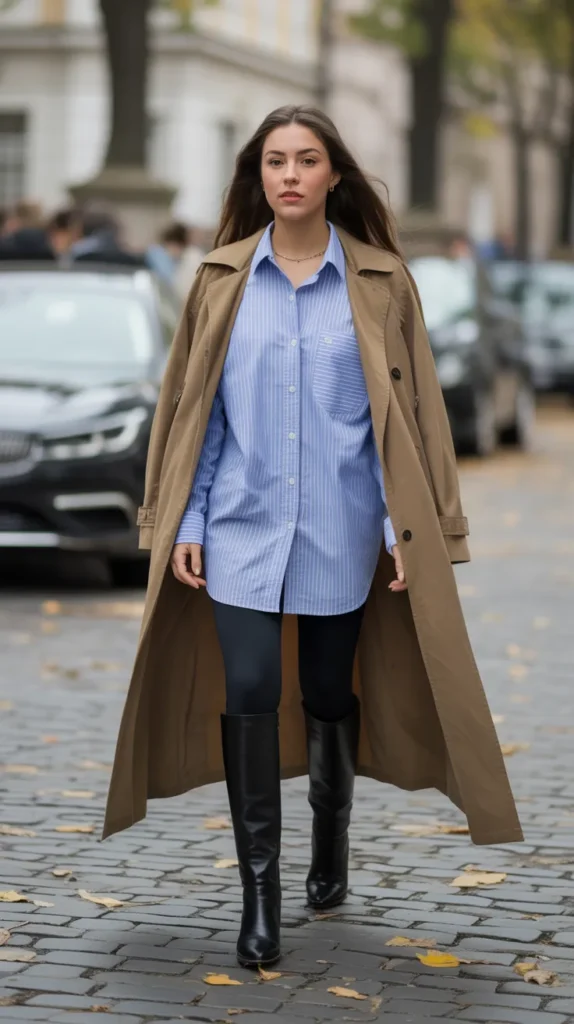 Comfort meets sophistication with this cozy pairing. The loose shirt keeps the silhouette relaxed, while knee-high boots and a trench coat add structure. It’s the perfect weekend outfit for chilly mornings or casual coffee runs.