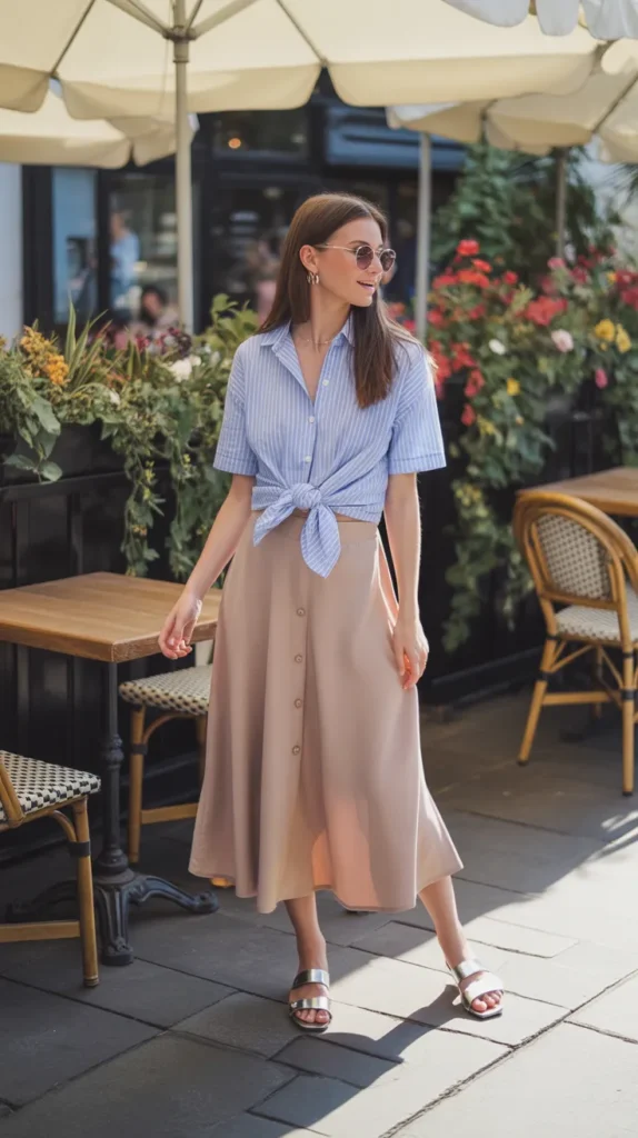 7. Knotted Button-Up with Midi Skirt