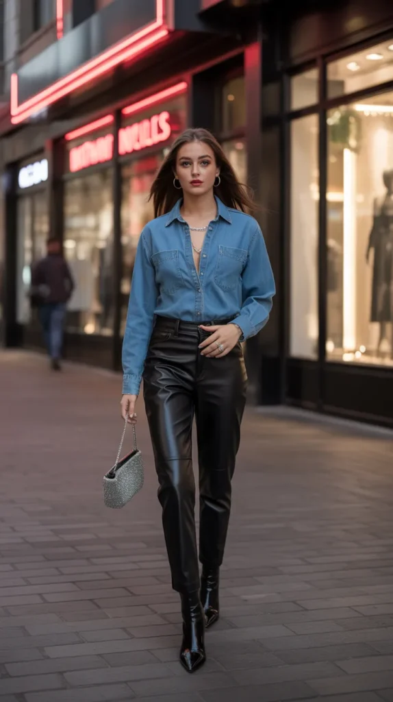 8. Denim Button-Up with Black Leather Pants
