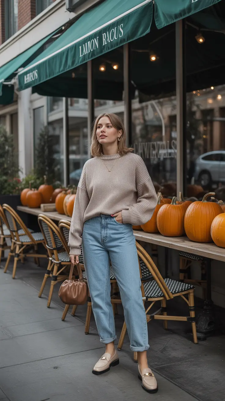 When it comes to comfy autumn looks, the crewneck sweater paired with mom jeans is a classic choice. This outfit strikes the perfect balance between relaxed fall style and effortless chic. The oversized fit of the sweater offers warmth and comfort, making it ideal for those crisp fall days.