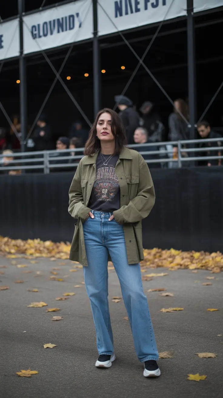 This outfit perfectly captures the essence of relaxed fall style. A graphic tee paired with a cozy flannel shirt offers a laid-back vibe that’s ideal for everyday fall fashion. The model showcases a classic combination that is both stylish and comfortable, making it a go-to choice for any casual outing.
