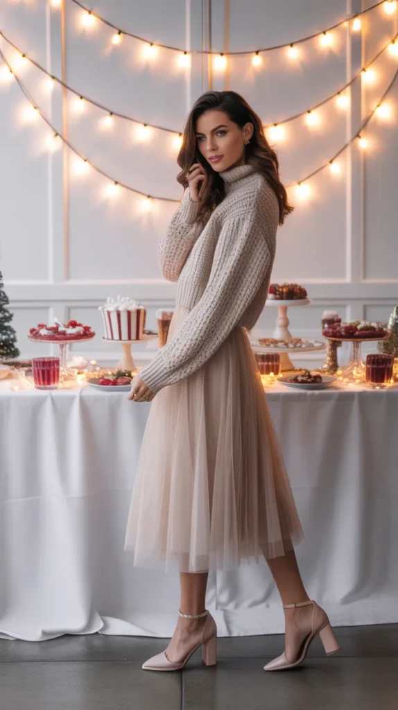 This combo mixes cozy with whimsical in the prettiest way. The chunky knit keeps things grounded and warm, while the tulle skirt adds movement and romance. Block heels make the outfit party-ready without sacrificing comfort. Add a sparkly clutch for a hint of festive flair. It’s perfect for casual Christmas party outfit plans where you want dreamy but wearable style.